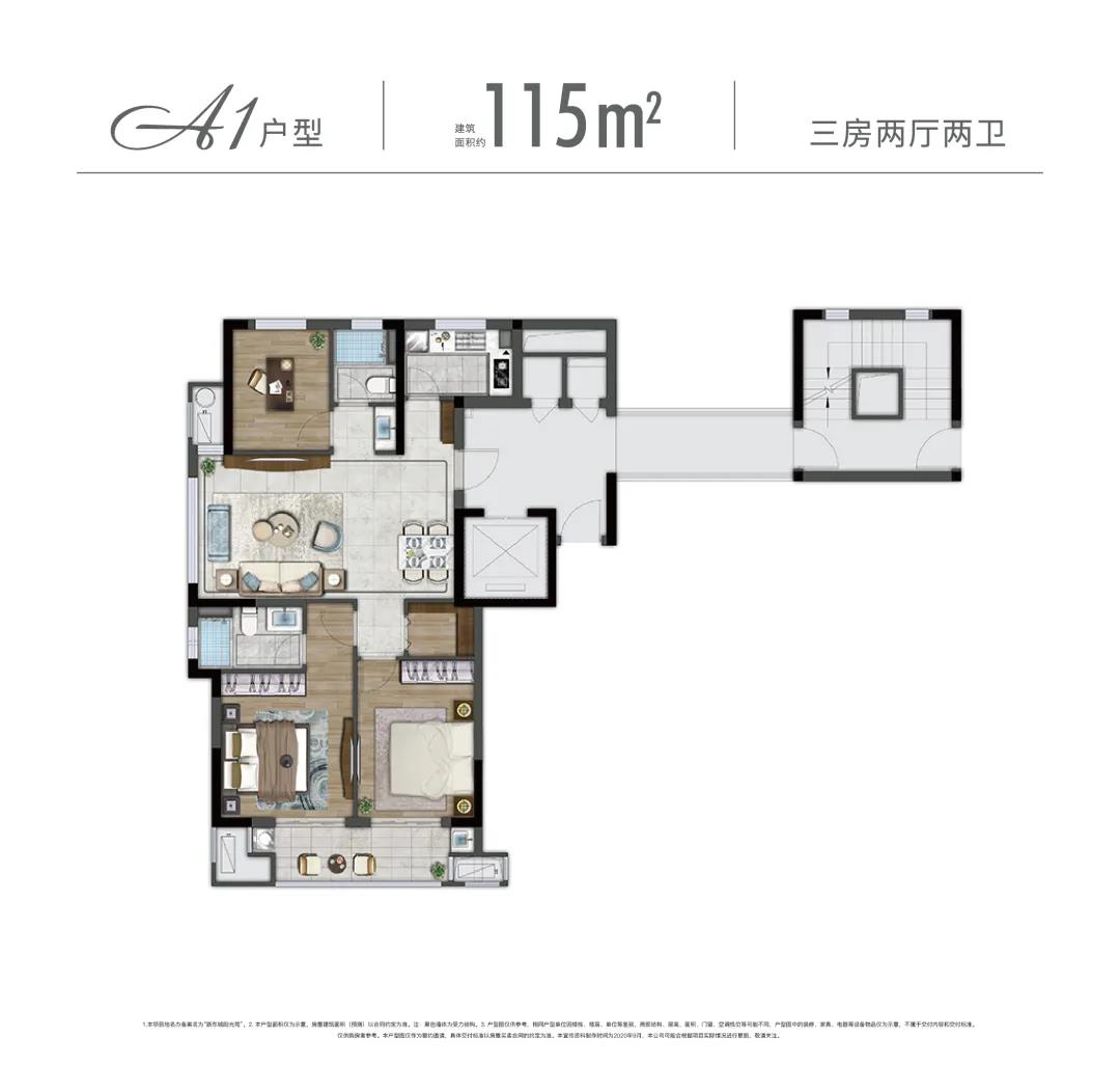 而115㎡同樣作為明星戶型,則更注重陽(yáng)光、景致與居住私密性。三面采光+餐客廳一體+套房式主臥+雙聯(lián)陽(yáng)臺(tái),將品質(zhì)與靜謐的生活周到考量,在一方美好空間里,可觀、可賞、可憩。